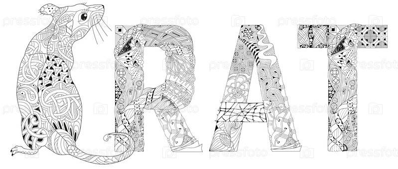 Zentangle стилизованная крыса со словом RAT. Ручное изображение векторного кружева