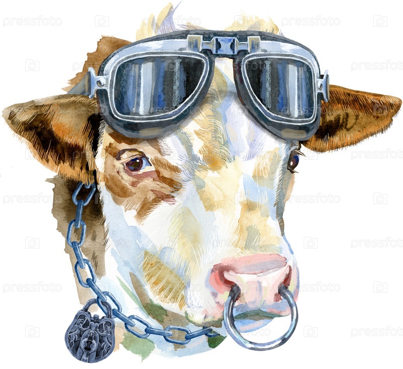 Акварельная графика быка. Бык в байкерских очках. Акварельный текстурированный фон иллюстрации животных