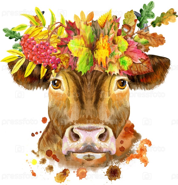 Бык в венке из осенних листьев. Акварельная графика. Иллюстрация животного быка с всплеском акварельного текстурированного фона