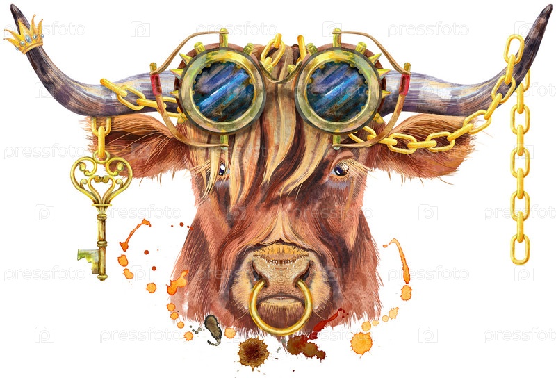 Акварельная иллюстрация коричневого длиннорогого быка в стимпанк-очках