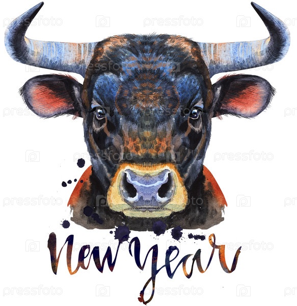 Акварельная иллюстрация черного мощного быка с вкраплениями