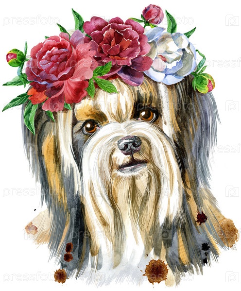 Акварельный портрет собаки породы йоркширский терьер с венком из пионов