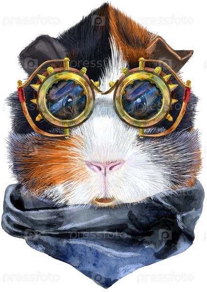 Симпатичная морская свинка в очках в стиле стимпанк. Свинья для графики на футболках. Акварельная иллюстрация абиссинской морской свинки