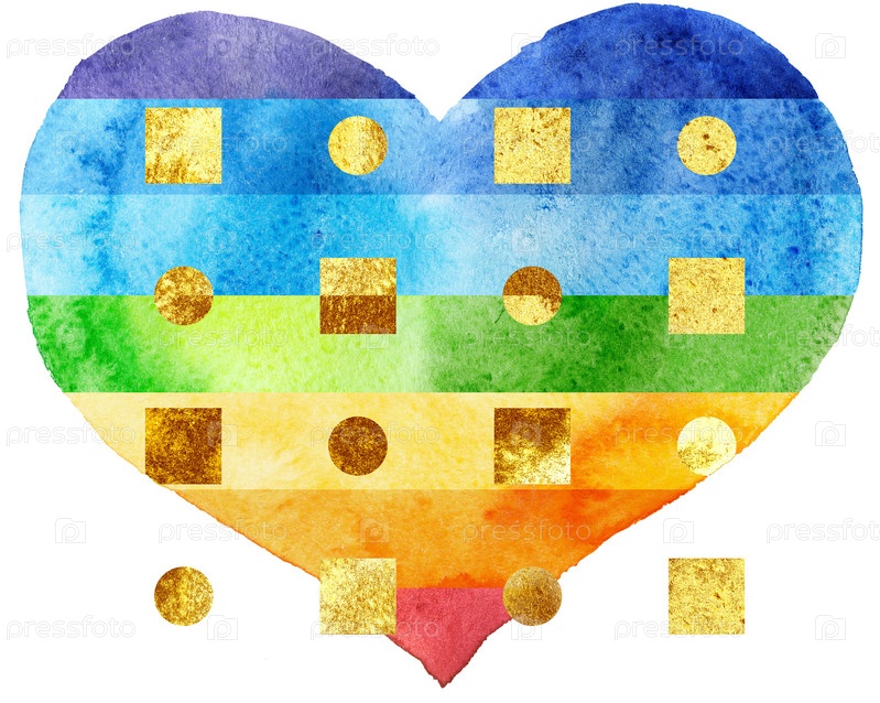 Радужное сердце с золотым узором в акварельной живописи, на белом фоне