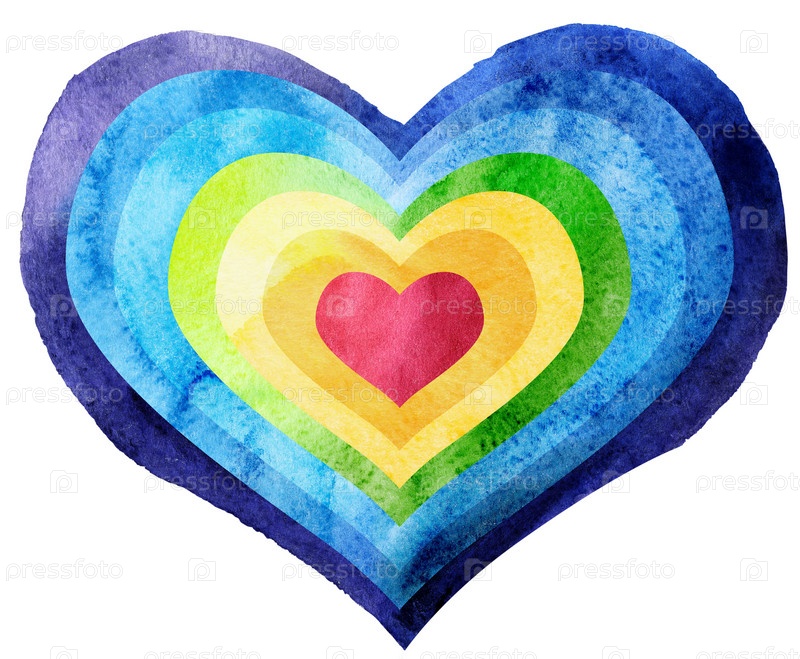 Радужное сердце в акварельной живописи, на белом фоне