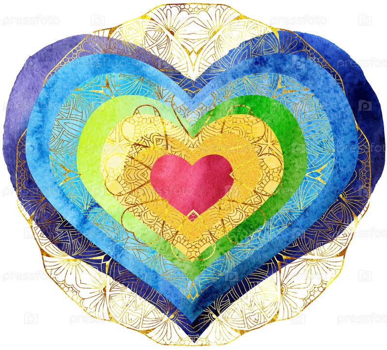 Радужное сердце с золотым узором в акварельной живописи, на белом фоне