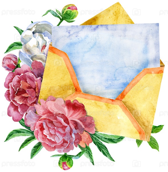 Акварель открытый ретро-конверт с бумагой и пионами. Элемент дизайна ручной росписи
