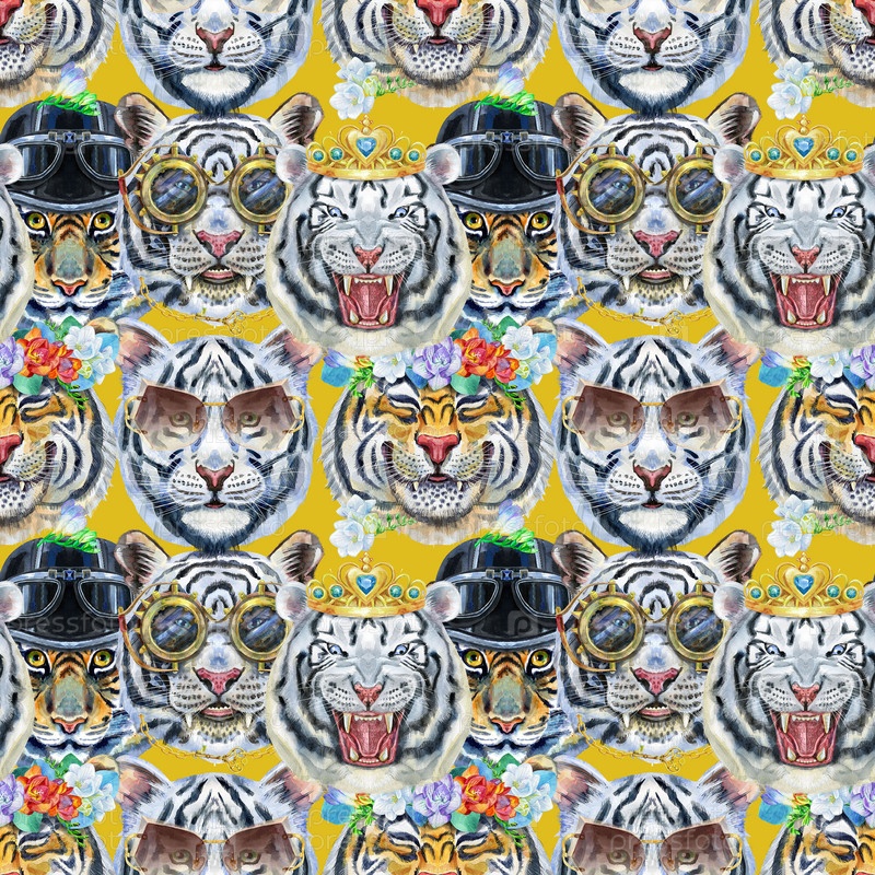 Акварель бесшовный узор с милыми тиграми на оливковом фоне. Модный дизайн ткани