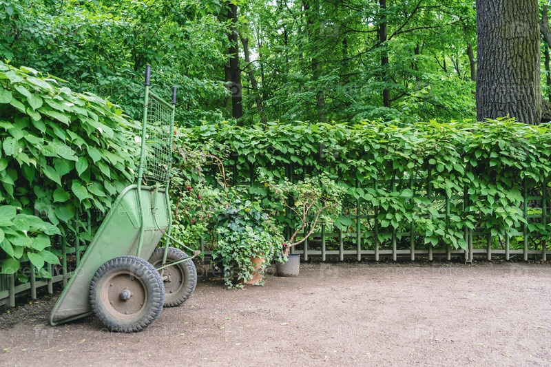 Зеленая тачка у забора с зелеными растениями в саду
