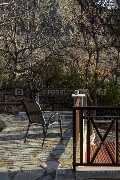 Чашка кофе и стул на балконе патио (регион Эпир, Греция)