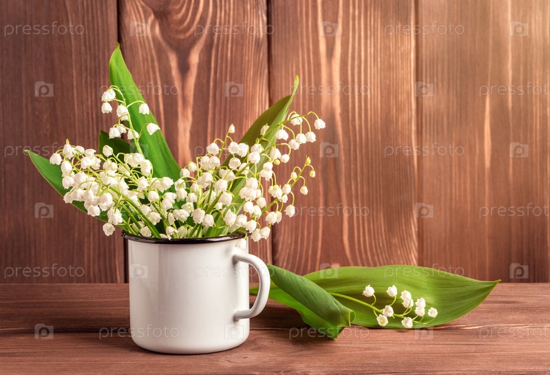 Букет белых ландышей на коричневом деревянном фоне