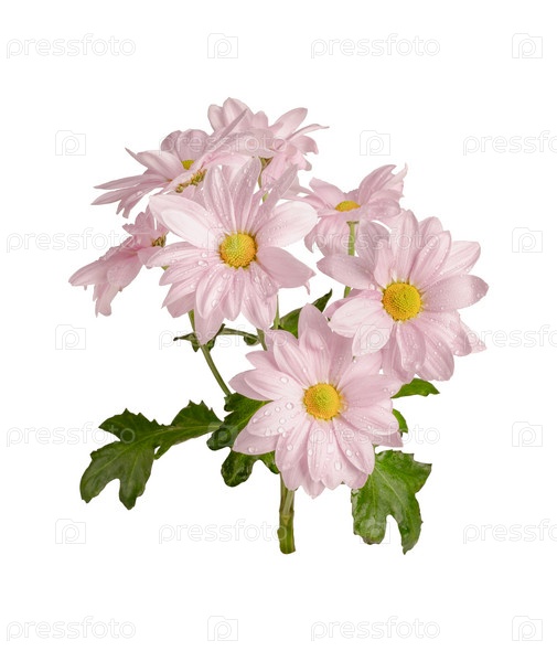 Изолированные на белом фоне цветущие хризантемы с каплями воды