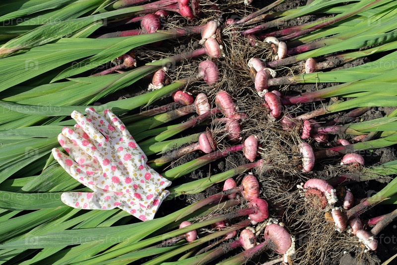 Луковицы гладиолусов сушат на грядке. Перчатки для защиты рук при работе в саду