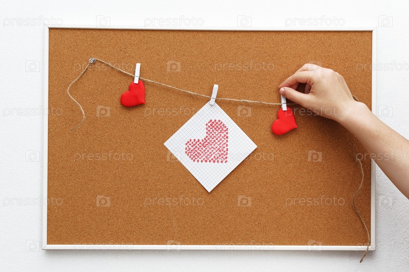 Рука человека вешает бумажные формы сердца на пробковую доску, которая висит на стене