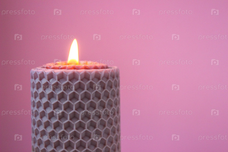 Горящая восковая свеча на розовом фоне