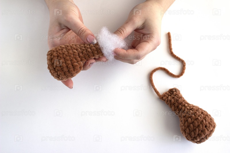 Процесс создания детской игрушки из плюшевой пряжи. Наполнение лапки медвежонка наполнителем. Рядом с работой есть одна готовая лапа