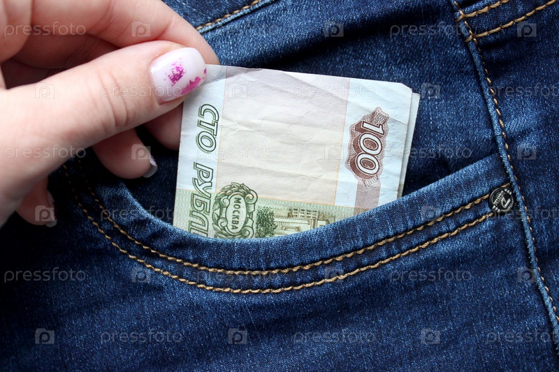 Русские деньги в кармане джинсов. Рука достает из кармана сто рублей