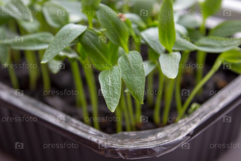 Молодые саженцы перца в лотке на подоконнике. Крупным планом фото. Домашнее садоводство, хобби, экологический продукт, ферма