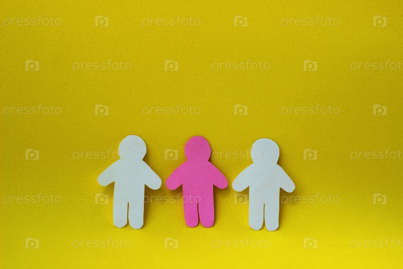 Бумага вырезала розового человечка между двумя фигурами людей из белой бумаги. Три фигуры. Совместная деятельность. Разнообразие