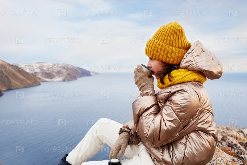 Путешественница молодой девушки пьет горячий чай из термоса на фоне природы