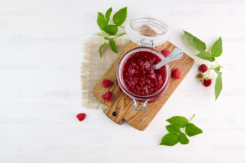 Малиновое варенье в стеклянной банке на белом деревянном фоне. Домашняя консервация и летний урожай