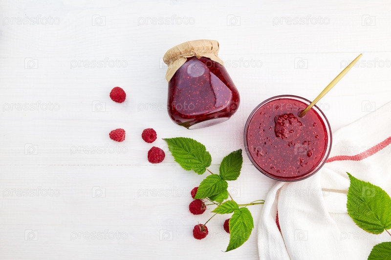 Малиновое варенье в стеклянной банке и миске на белом деревянном фоне. Домашняя консервация