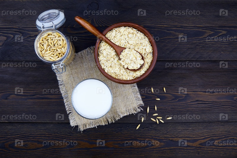 Овсяное молоко в стакане, овсяные зерна в банке, овсянка в миске на льняной салфетке