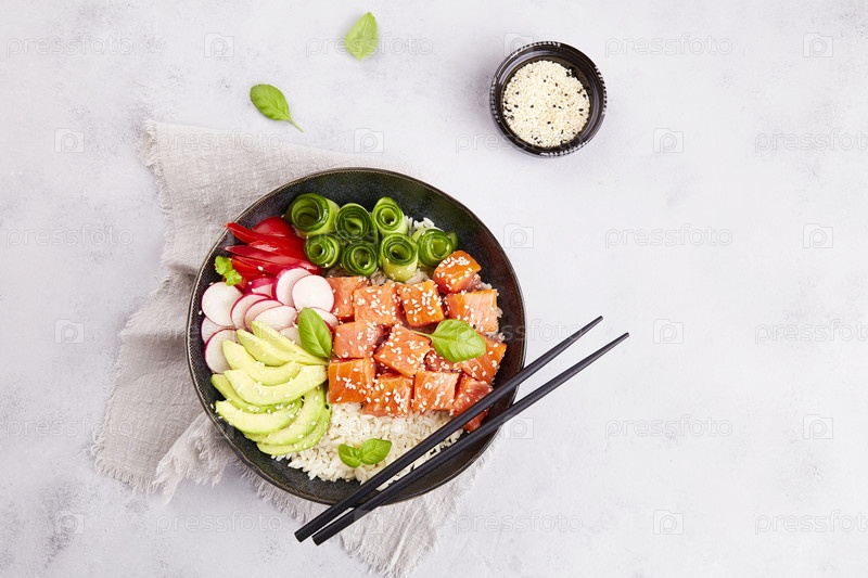 Поке боул с лососем или тунцом, рисом, авокадо, огурцом, редисом, перцем, кунжутом