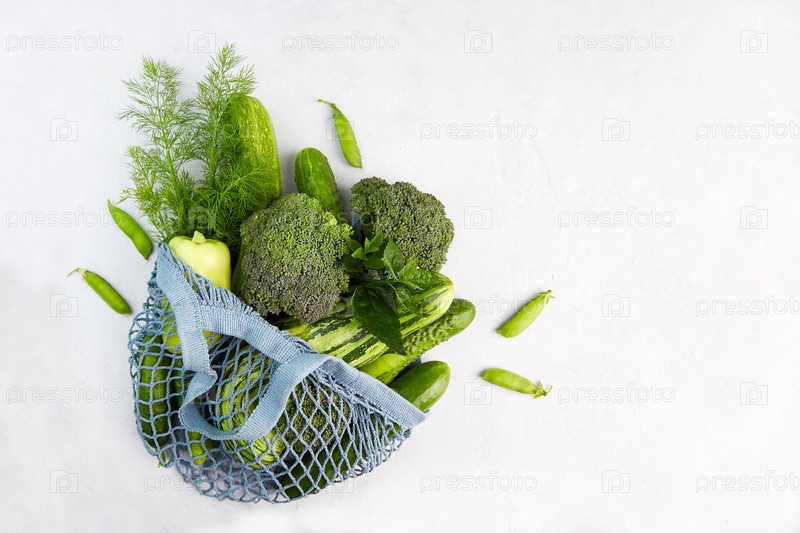 Зеленые овощи в авоське на сером фоне. Цуккини, огурец, перец, брокколи, укроп, зеленый горошек