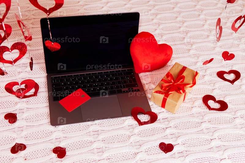 Ноутбук, кредитная карта, подарок, декор, сердечки на белом вязаном одеяле