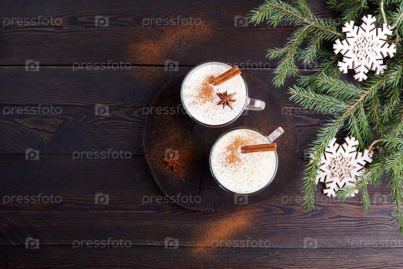 Традиционный зимний гоголь-моголь на темном деревянном фоне. Напиток с тертым мускатным орехом, молоком, взбитыми яйцами, корицей