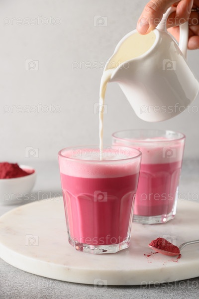 Свекольный латте на сером фоне. Приготовление альтернативного кофе без кофеина
