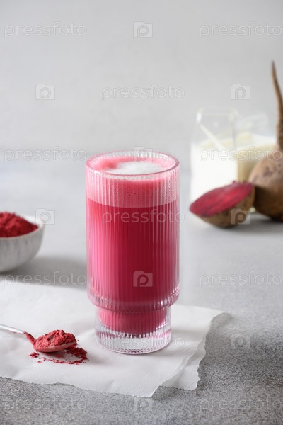 Свекольный латте или латте с розовым лунным молоком из свекольного порошка на белом фоне. Модный здоровый веганский напиток без кофеина. Закрыть
