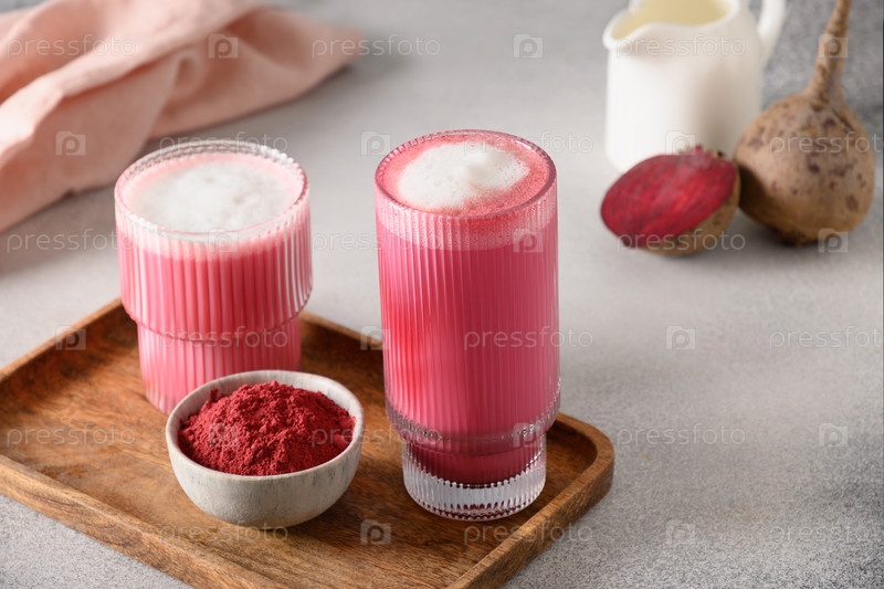 Свекольный латте или латте с розовым лунным молоком в стеклянной чашке свекольного порошка на сером фоне. Модный веганский напиток без кофеина. Закрыть