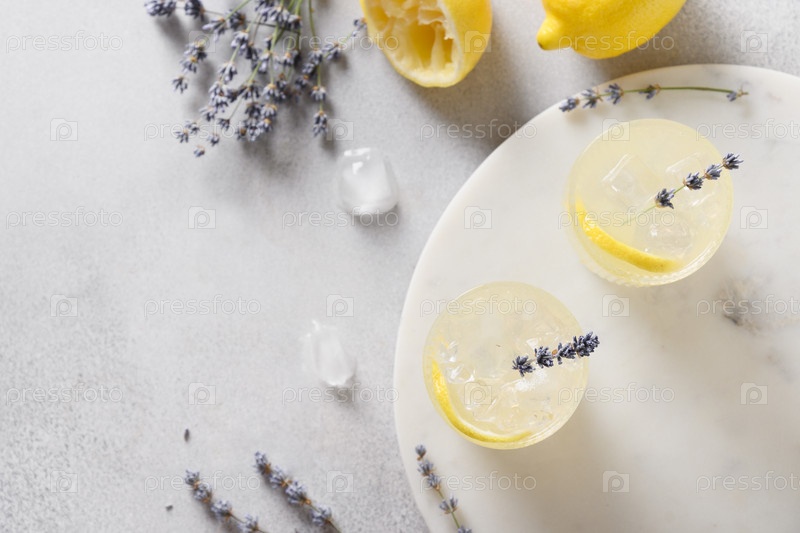 Игристый летний лавандовый лимонад в очках на сером фоне