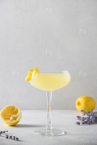 Летний лавандовый лимонад с цитрусовыми в стекле на белом фоне
