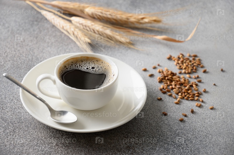 Ячменный кофе в белой чашке и колосья ячменя на сером фоне