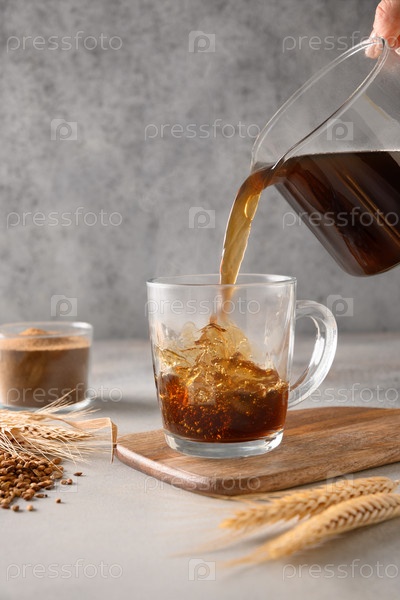 Наливание ячменного кофе в стеклянную чашку на сером фоне. Готовим здоровый альтернативный кофе без кофеина. Закрыть. Вертикальный формат