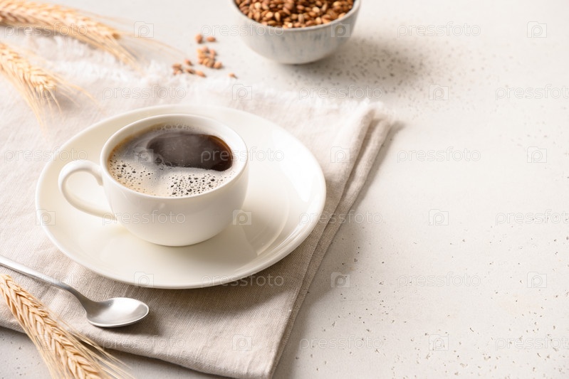 Ячменный кофе в белой чашке, бобы и колосья ячменя на белом фоне. Лучшая натуральная альтернатива органическому кофе без кофеина. Напиток-заменитель кофе, приготовленный из полезной смеси жареного ячменя. Закрыть