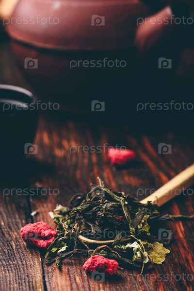 Чайные чаши с чайником и ложкой малинового травяного чая