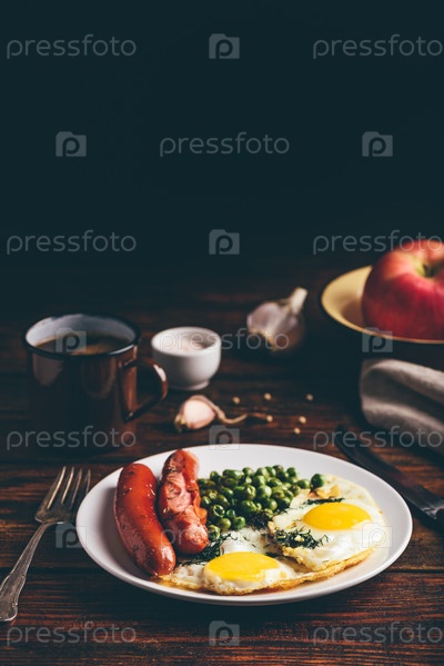 Завтрак с яичницей, сосисками и зеленым горошком