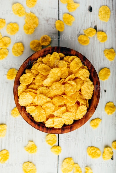 Кукурузные хлопья на завтрак в деревянной миске