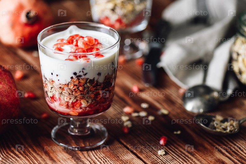 Гранатовое парфе с ингредиентами на фоне. Серия о приготовлении полезного десерта с гранатом, мюсли, сливками и джемом