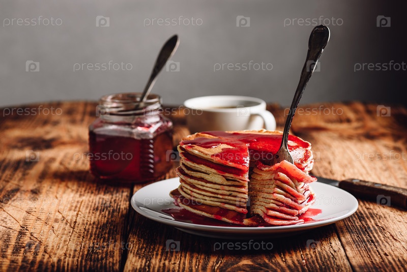 Стопка американских блинчиков с вареньем из красных ягод