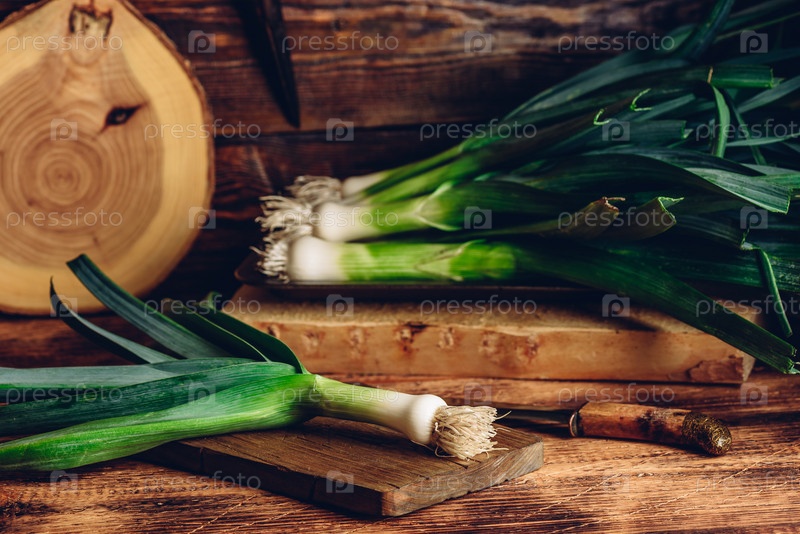 Свежий зеленый лук-порей на разделочной доске