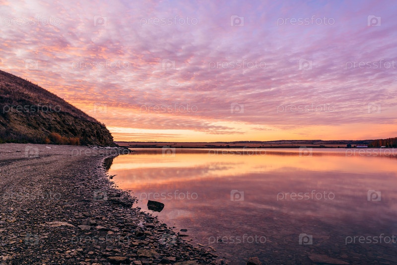 Восход солнца на холмистом побережье реки Зай