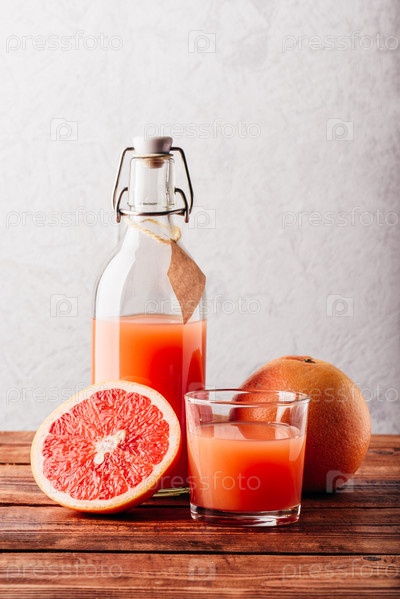 Бутылка грейпфрутового сока со стеклом и фруктами
