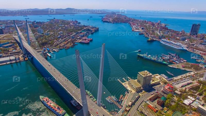 Вид с воздуха на панораму города с видом на Золотой мост