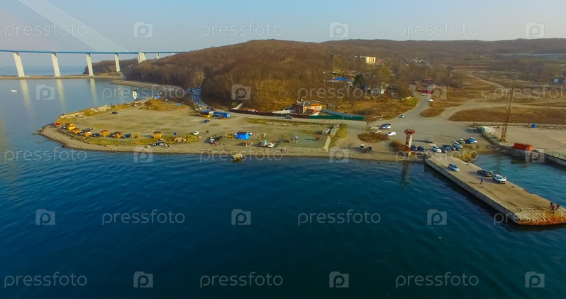 Воздушный обзор береговой линии острова Русский с причалом и кораблями