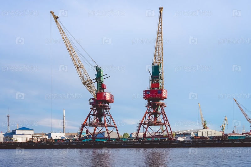 Порт большого русского города с кораблями и различной техникой на фоне реки